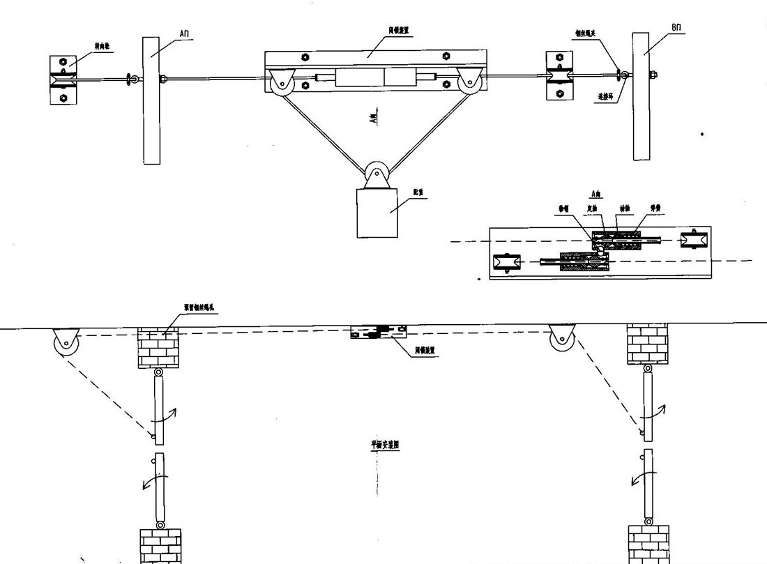 機(jī)械閉鎖裝置是怎么工作的呢?機(jī)械閉鎖裝置主要是用于兩道無(wú)壓風(fēng)門(mén)的,當(dāng)A門(mén)開(kāi)啟時(shí)帶動(dòng)鋼絲繩移動(dòng),固定在鋼絲繩上的定軸隨之移動(dòng),彈簧伸長(zhǎng)將動(dòng)軸頂起,動(dòng)軸將軸銷推到另一側(cè),軸銷將與B門(mén)相連的鋼絲繩上的定軸固定,B門(mén)不能開(kāi)啟。當(dāng)A門(mén)關(guān)閉時(shí),配重帶動(dòng)鋼絲繩向回移動(dòng),定軸將動(dòng)軸壓回原位,軸銷可以移動(dòng),B門(mén)解鎖。同理,B門(mén)開(kāi)啟時(shí),A門(mén)也不能開(kāi)啟。